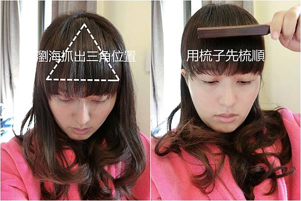 #接下來上一點點定型液將剛才的瀏海固定捲度!